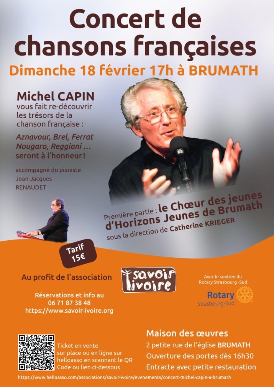 Je vous invite à venir écouter Michel Capin, chanteur, amateur, engagé pour les actions humanitaires autant en Alsace que dans les pays lointains. Son répertoire va vous plaire ! Ce sont des chansons françaises qu'il interprète avec brio avec toute son âme : Aznavour, Brel, Bécaud et bien d'autres... Ce concert est dédié à la toute petite association Savoir ivoire, qui depuis 20 ans à l'initiative de notre amie Marianne Maridet, institutrice à la retraite, fait de grandes choses dans les écoles d'Abidjan en Côte d'Ivoire. La marraine de cette association est Fatou Keita, écrivaine. Cette intervention concerne 11 écoles partenaires, ce qui représente 41 000 élèves.